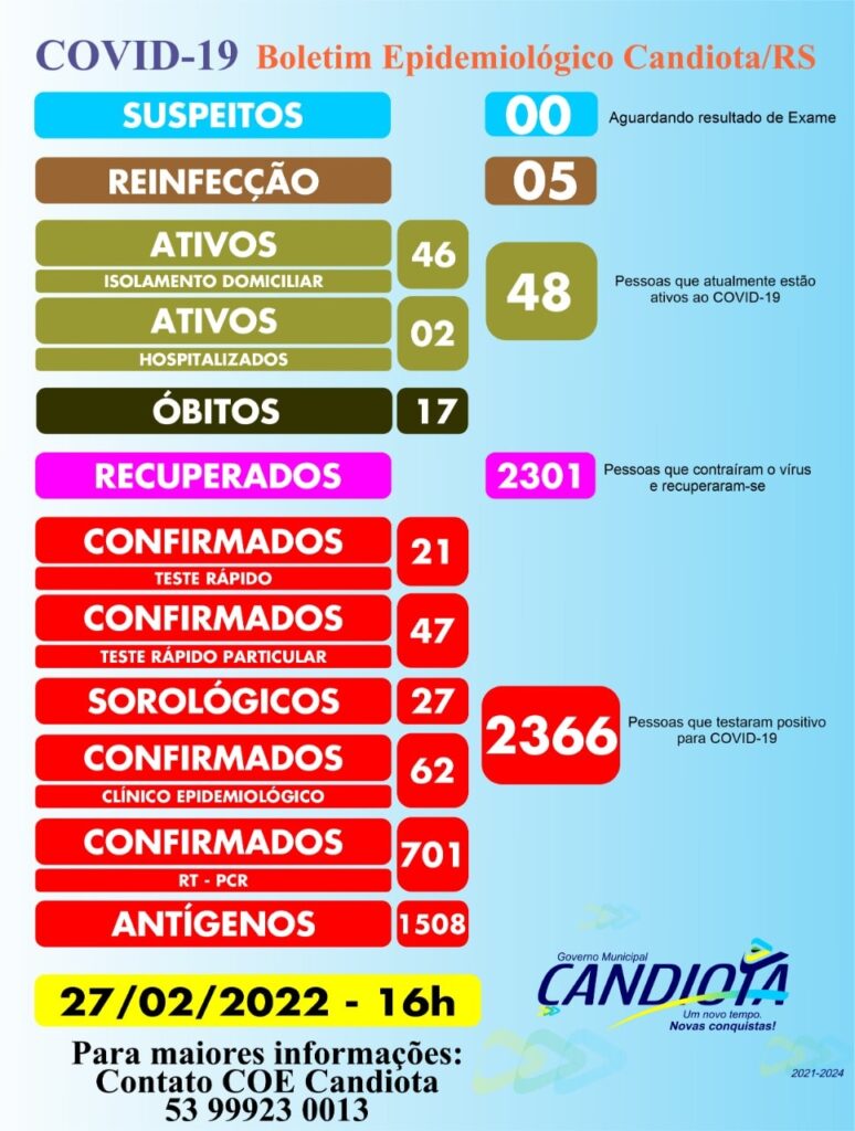 O COE salienta que conforme o Ministério da Saúde, pacientes que já foram positivados para covid-19 anteriormente, só são contabilizados como reinfecção quando tiverem os dois resultados por exames RT_PCR confirmados.