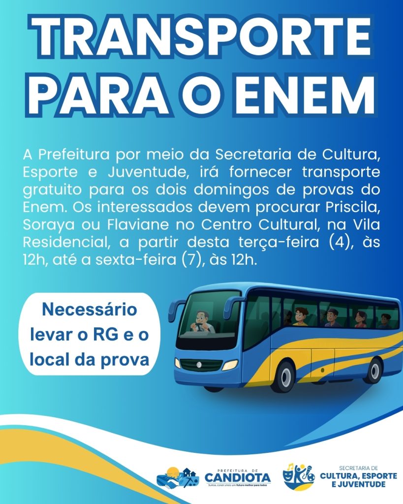 A Prefeitura de Candiota por meio da Secretaria de Cultura, Esporte e Juventude, irá fornecer, de forma gratuita, transporte para os dois domingos de provas do Exame Nacional do Ensino Médio (Enem), que neste ano será realizado nos dias 9 e 16 de novembro.